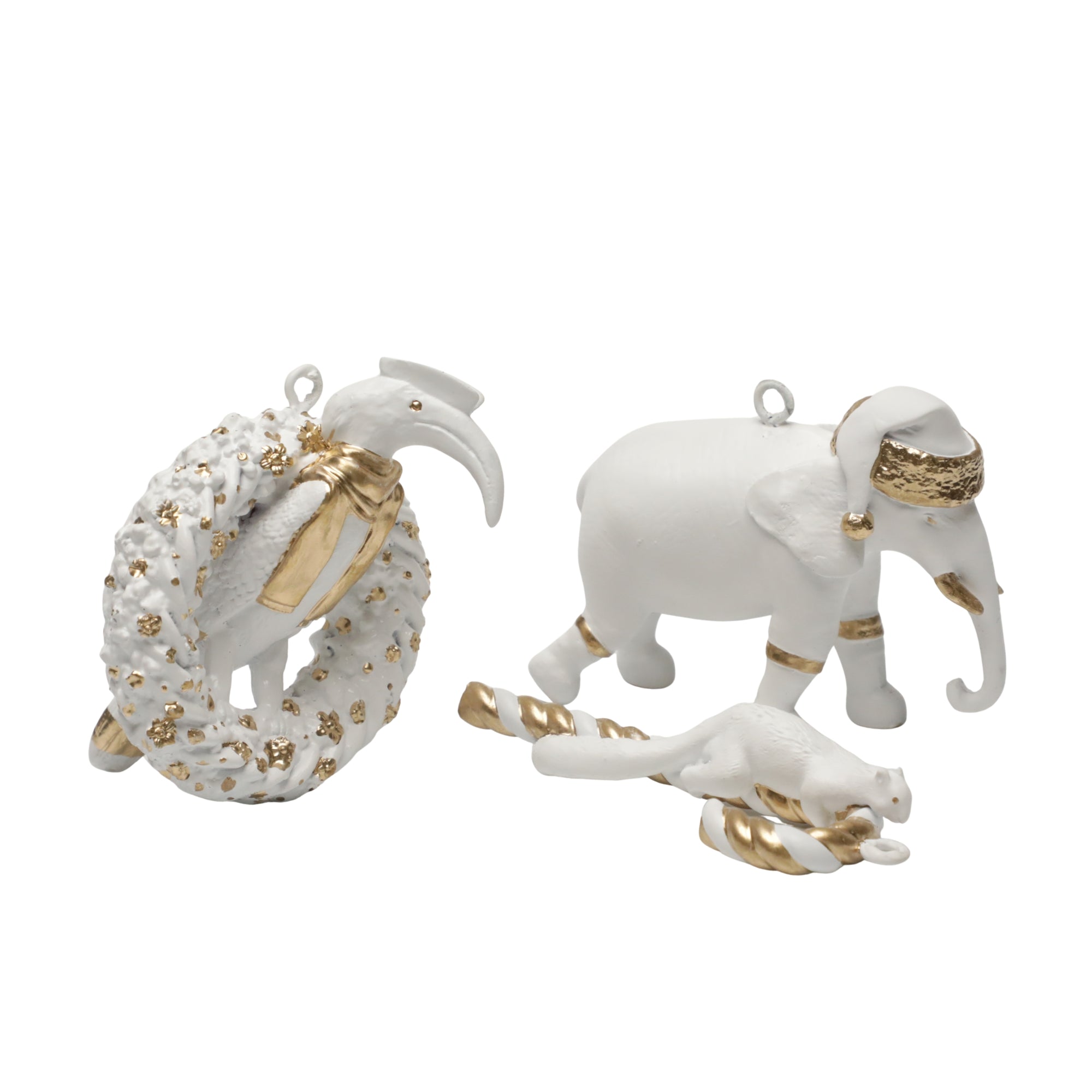 Includes: hanging ribbons, 1 Hornbill on wreath , 1 squirrel on candy cane and 1 Elephant in stockings tree hangings with a holiday card